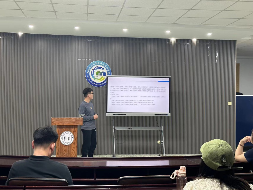 产业经济学专业的马振邦同学就论文选题进行探讨与分享。他首先结合自己参加过的科研项目和学术会议,分享了在此过程中的收获与体会,强调选题的重要性,鼓励同学积极参加学术会议,把握专业前沿与研究进展,在论文写作方面建议同学们广泛阅读文献,深入思考选题。