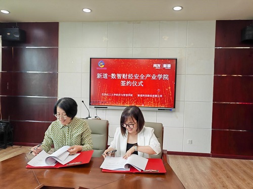 校企双方围绕“产教融合共建现代产业学院”主题开展了深入交流,取得积极成果。双方同意在前期多年合作的基础上,共建“沈阳化工大学数智财经安全产业学院”,并举行了签约仪式。