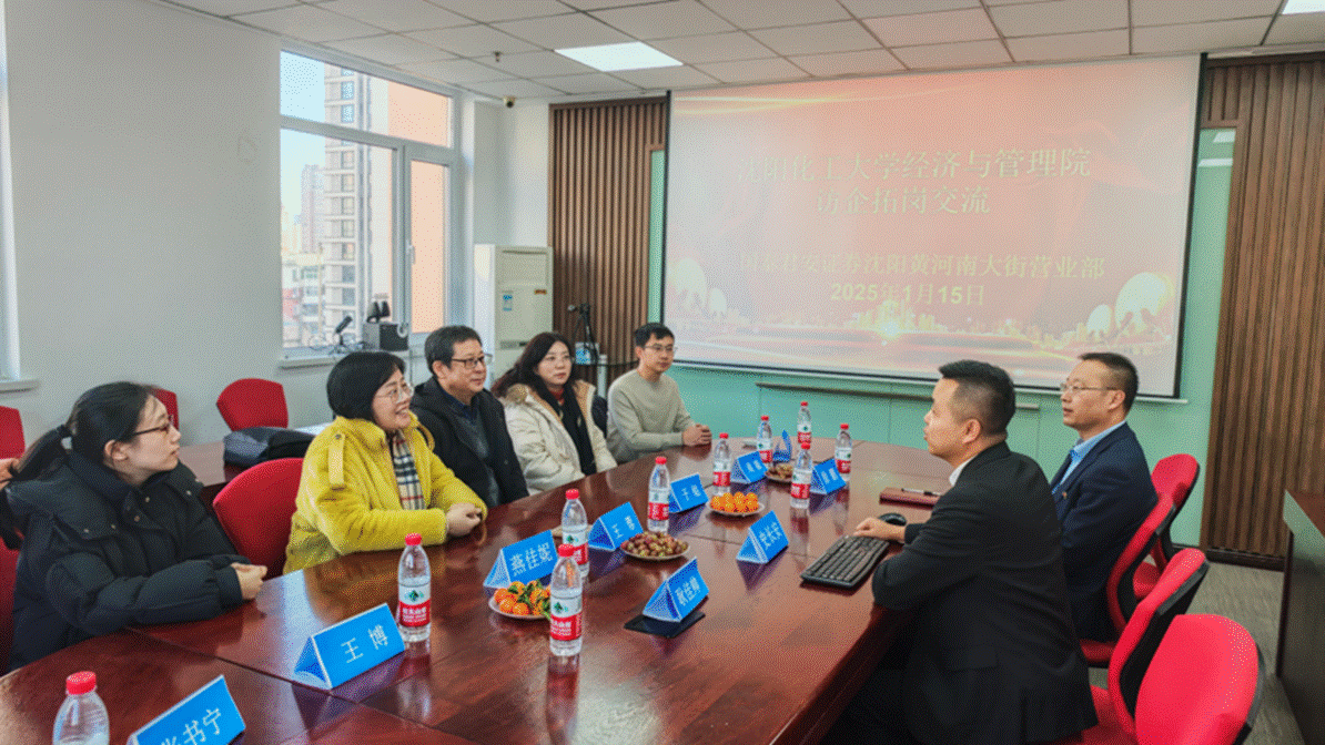 2025年1月15日,沈阳化工大学betway西汉姆联官网院长王蓉、金融学教研室主任于铭、专业教师周颖、燕佳妮、毕业生辅导员、在读研究生等一行7人前往国泰君安证券沈阳黄河南大街营业部开展访企拓岗活动,与营业部总经理史长安、党支部书记徐鹏、业务骨干耿佳帅进行交流探讨。